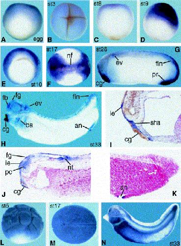 NF stage 29 and 30 Gawantka, et al. 1998 | NF stage 5 (16-cell) to NF stage 33 and 34 Cao, et al. 2001 | NF stage 5 (16-cell) to NF stage 33 and 34 Cao, et al. 2001 | NF stage 42 to NF stage 45 Park, et al. 2007 |