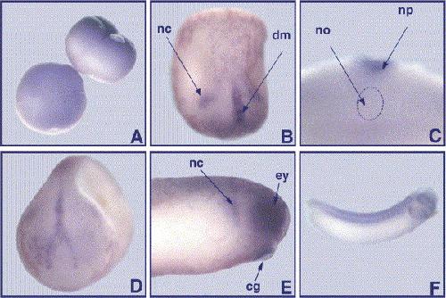 | animal hemisphere brain branchial arch cement gland dorsal egg endomesoderm eye hatching gland head liver neural crest neural plate skin somite upper blastopore lip whole organism |
