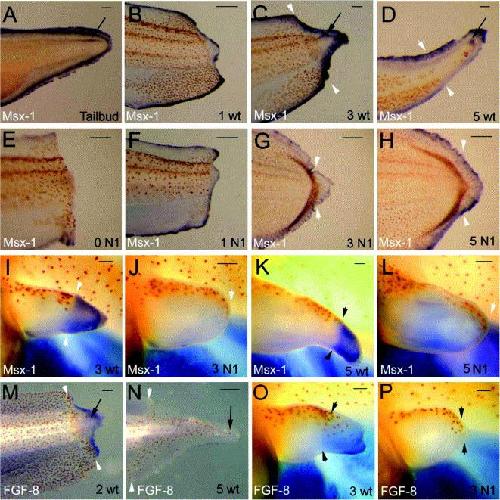 Fig. 5. Gene expression in regenerating wild type and N1 limbs and tails. AâH In situ hybridization showing Msx1 expression in tails. Black arrows indicate regions of Msx1 expression in the tail bud or regeneration bud. (A) Wild type (WT) embryotail during development, expression in dorsal posterior neural tube (arrow) and fin, stage 36. (B) Wild type tadpoletail 1 day after amputation, expression in finepidermis maintained. (C, D) Wild type tadpoletail 3 and 5 days after amputation, expression re-established in neural ampulla. White arrowheads show level of amputation. (E) Msx1 is not normally expressed in tail core tissues, but only in finepidermis, as shown in this N1 tail fixed immediately after amputation. (FâH) Msx1 is not re-expressed in heat-shocked N1 tails at 1, 3 and 5 days after amputation. White arrowheads show level of amputation. (IâL) In situ hybridization showing Msx1 expression in limbs, following amputation at future knee level at stage 53. Arrowheads show the level of amputation. (I, K) Wild type (WT) limb 3 days and 5 days after amputation, Msx1 is expressed throughout the blastematissue but absent from the AEC. (J, L) Msx1 is not expressed in heat-shocked N1 limbs 3 or 5 days after amputation. (MâO) Expression of FGF8 in regenerating tails and limbs. Level of amputation is marked by arrowheads. (M, N) WT tadpoletail 2 and 5 days post amputation, showing expression in fin and blastema (black arrows). (O, P) WT and heat-shocked N1 limbs amputated at knee level at stage 53 and fixed after 3 days. FGF8 expression is seen in WT limbs in the AEC but is detectable only in around 50% of N1 limbs and at lower levels. All scale bars 100 μm.