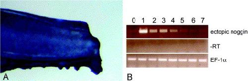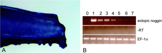 Fig. 2. Ectopic noggin expression and decay following heat shock in N1 tadpoles. (A) In situ hybridisation 3 days after amputation showing ectopic expression of noggin at high levels throughout the tail and the regeneration bud (right end of tail). Heat shocks were given daily following amputation. (B) RT-PCR showing that the level of induced noggin transcripts declines approximately exponentially following a single heat shock. EF1α is used as a control housekeeping gene to indicate loading levels.
