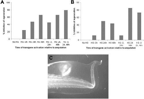 Fig. 6. Timing of BMP requirement during tail and limb regeneration. (A, B) Histograms showing inhibition of regeneration (expressed as % of cases of N1 tadpoles) under different heat shock transgene activation regimes. Heat shocks were administered to tadpoles at different combinations of â3 h, +24 h and +48 relative to the time of amputation. Refer to Table 2 and Table 3 for numerical data. (A) % of stage 49�50 tails failing to regenerate following 50% amputation and recovery for two weeks. (B) % of stage 52-53 limbs failing to regenerate following knee level amputation and recovery for three weeks. (C) Partial regenerate arising from the resumption of regeneration of a tail following the end of the heat shocks.