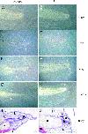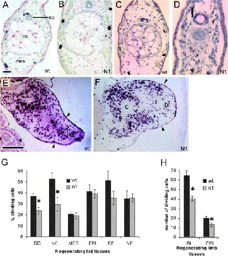 Fig. 7. Effect of ectopic noggin on cell proliferation and cell death. (A, B) BrdU labelling in 3 day tail regenerates, wild type (A) and heat-shocked N1 (B). nc notochord, sc spinal cord, mes mesenchyme. (C, D) TUNEL labelling in 3 day tail regenerates, wild type (C) and heat shocked N1 (D). (E, F) BrdU labelling in 3 day limb bud regenerates, wild type (E) and heat-shocked N1 (F). Arrowheads show approximate level of amputation. bl, blastema, c, cartilage condensation. Scale bars represent 100 μm. (G) Percentage of dividing cells in different tissues of amputated, regenerating wild type (WT) or heat-shocked N1 tails. NT, neural tube; NC, notochord; MES, mesenchyme; EPI, skinepidermis; DF, dorsal fin; VF, ventralfin. Values are expressed as means with N = 5 except for N1 NT and DF where N = 4. Error bars are -1SE. Significant differences (p < 0.05) between equivalent tissues in WT and N1 tails are marked â (Mann-Whitney U test). (H) Number of dividing cells in 0.1 mm square of blastema (BL) or 0.2 mm length of epithelium (EPI) in sections of amputated, regenerating wild type (WT) or N1 tails heat shocked after 2 days of regeneration and labelled with BrdU 4 h later for 20 h. Values are expressed as means with N = 6 for all sets. Error bars are -1SE. Significant differences (p < 0.05) between equivalent tissues in WT and N1 tails are marked â (Mann-Whitney U test).