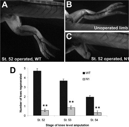 Fig. 4. Effect of ectopic noggin expression on limb regeneration. A-C examples of limb regeneration following amputation at future knee level at stage 52 and recovery for 3 weeks. (A) Wild type. (B) Control un-operated limb. (C) N1 heat-shocked for 7 days. (D) Histogram of limb regeneration at different stages in development with (heat-shocked N1) or without (WT) expression of the noggin transgene. The average number of toes regenerated following knee level amputation declines with increasing age of amputation and is significantly reduced at all stages tested by ectopic expression of noggin from the transgene (p > 0.01, Student's t-test, denoted by ââ).