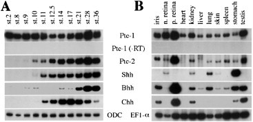 Distinct expression of two types of Xenopus Patched genes during early embryogenesis and hindlimb development.
