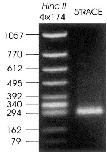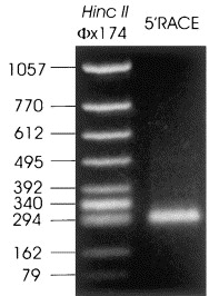 Fig. 2. Verification of the transcription initiation site. Molecular weight standards (left lane; Hinc II ΦX174) and the product of a 5′ RACE PCR (right lane) were separated on a 1% TBE/agarose gel and stained with ethidium bromide. The RT-PCR was performed with three, successive, 3′-directed NF-M(2) gene-specific primers, beginning with total RNA isolated from brain. The final PCR was performed with an NF-M(2) gene-specific primer directed against sequences 250 nucleotides downstream from the initiation codon, which is approximately 310 and 690 nucleotides away from each of the two putative TATA boxes. A single strong band of PCR product occurs at approximately 300 bp.