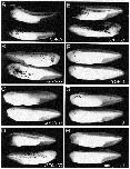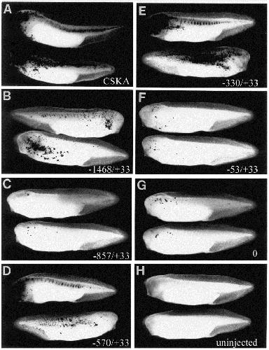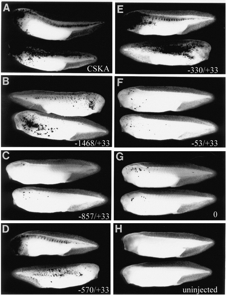 Fig. 3. β-Galactosidase reporter gene expression in plasmid-injected albino tadpoles (stages 35/36–39). Embryos were injected at the 2-cell stage with 100 pg of a given β-galactosidase reporter construct in pBluescript plus 100 pg of pCSKA-GFP. Each β-galactosidase construct contained a different URS, either that of CSKA or different lengths of that of NF-M(2). Two typical specimens from each series are shown. (A) tadpoles injected with β-galactosidase driven by the CSKA URS. (B)–(G) tadpoles injected with β-galactosidase driven by −1468/+33 URS (B), −857/+33 URS (C), −570/+33 URS (D), −330/+33 URS (E), −53/+33 URS (F), and 0 URS (G). (H) uninjected tadpoles. Dorsal is up in all cases. Most tadpoles are shown anterior to the left, but the upper tadpoles in (B) and the lower tadpoles in (D) and (E) are shown anterior to the right.