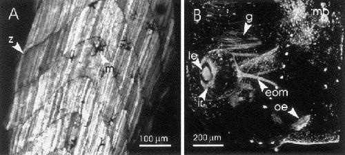 Fig. 5. Confocal microscopic image of GFP-reporter gene expression in fixed preparations of stage 48 pigmented transgenic tadpoles. (A) Expression of GFP-reporter gene in tail somites of specimen JR27-5. GFP expression is resolvable in individual muscle cells within the somites. The image was composed from a stack of 168 image planes, 2 μm apart. Anterior is up. z, example of z-line at the inter-somitic junction; m, example of a melanophore. (B) Expression of GFP-reporter gene in the head of JR27-20. The image was composed from a stack of 159 image planes, 10 μm apart. Anterior is down. GFP expression occurs in a variety of head structures including lens (le), iris (ir), extra ocular muscles (eom), olfactory epithelia (oe), gills (g), midbrain (mb), and scattered epidermal cells.