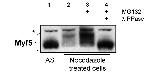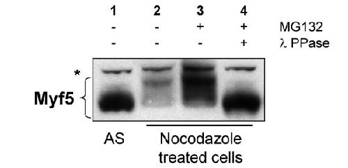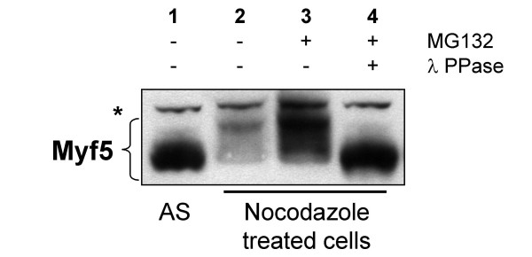 Figure 1. Myf5 mitotic degradation is conserved in non-muscle cells. HeLa-S3 cells expressing Myf5 under an inducible promotor (tetoff) were treated (lanes 2, 3, 4) or not (AS, lane 1) with nocodazole (200 ng/ml) for 16 h, as in [20]. In lanes 3 and 4, cells were treated with a proteasome inhibitor (MG132, 50 μM) for 2 h prior to lysis (as described in Methods). In lane 4, extract was incubated with Lambda phosphatase (New England Biolabs) for 30 min at 30°C. 25 μg of each extract were resolved by 10% SDS-PAGE and immunoblotted with anti-Myf5 antibodies. AS: asynchronous cells; * indicates a non specific band recognized by the antibodies that can be used as a loading control.