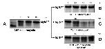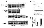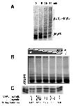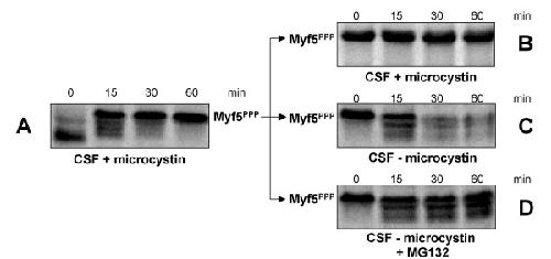 Figure 3. Hyperphosphorylated Myf5 is stable. An equal volume of reticulocyte lysate containing in vitro translated Myf5 and of Xenopus mitotic egg extract (CSF) were incubated together for 60 min in the presence of 1 μM microcystin LR. At each time point, 0.5 μl samples were analyzed by 10% SDS-PAGE (panel A). After this initial incubation, 2 μl of the reaction mixture containing hyperphosphorylated Myf5 (Myf5PPP) were further incubated in 18 μl of fresh mitotic extract, either in the presence of 1 μM microcystin (panel B) or without inhibitor addition (panel C), or without microcystin and in the presence of the proteasome inhibitor MG132 (200 μM, panel D). At each time point, 2 μl samples were analyzed by 10% SDS-PAGE.