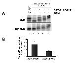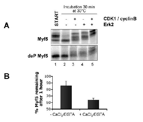 Figure 4. Several signaling pathways are likely to control Myf5 mitotic degradation (A) 1 μl of untreated (upper panel) or dephosphorylated (deP, lower panel) Myf5 was incubated with buffer (lane 2), recombinant CDK1/cyclin B (New England Biolabs, 40U, lane 3), recombinant Erk2 (New England Biolabs, 200U, lane 4) or both kinases (lane 5) for 30 min at 30°C. The reaction mix was resolved by 10% SDS-PAGE. Start is a non-incubated control. (B) Myf5 degradation is sensitive to very low concentrations of calcium: a mitotic extract was prepared using XB without CaCl2 but supplemented with 6 mM EGTA (see Methods), then incubated with 0.1 mM CaCl2 and 6 mM EGTA, or an equivalent volume of water as a control, for 10 min at 25°C. 2 μl of Myf5 were incubated for 1 hour with 18 μl of treated extract. 2 μl samples were resolved by 10% SDS-PAGE at the beginning and the end of the reaction. Myf5 degradation rate was quantified as previously described; the graph represents mean values of 3 experiments. Bars represent standard deviations.