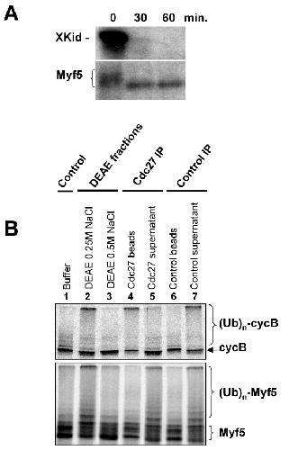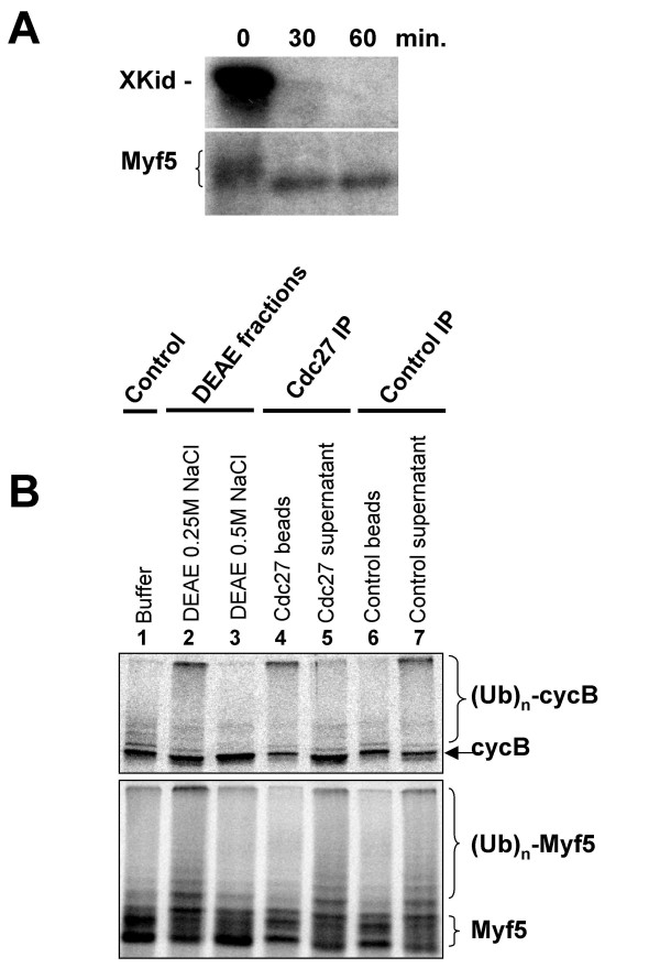 Figure 6. The E3 responsible for Myf5 ubiquitylation is not the APC/C. (A) In vitro translated Xkid (upper panel) or Myf5 (lower panel) were incubated in 15 μl Xenopus interphase egg extract in which Cdh1 has been translated [39]. After the times indicated, 2.5 μl were analyzed by SDS-PAGE and fluorography. (B) 1 ml of mitotic extract was activated with 1 μM microcystin LR (in order to fully activate APC/C), then fractionated on a DEAE column (see Methods). Bound proteins were eluted in two steps with buffer A containing 0.25 M and 0.5 M NaCl, respectively. Each fraction (lanes 2 & 3) was compared to a control reaction containing buffer (lane 1) for its ability to mediate ubiquitylation of either cyclin B (upper panel) or Myf5 (lower panel). Lanes 4–7: the 0.25 M NaCl eluate that mediates both cyclin B and Myf5 ubiquitylation was then subjected to immunoprecipitations using either anti-Cdc27 or control antibodies. For each immunoprecipitation, both the material bound to the beads or the supernatant were analyzed for ubiquitylation activity using cyclin B (upper panel) or Myf5 (lower panel) as a substrate. (Ub)n-cycB and (Ub)n-Myf5 indicate poly-ubiquitylated forms of cyclin B and Myf5, respectively.