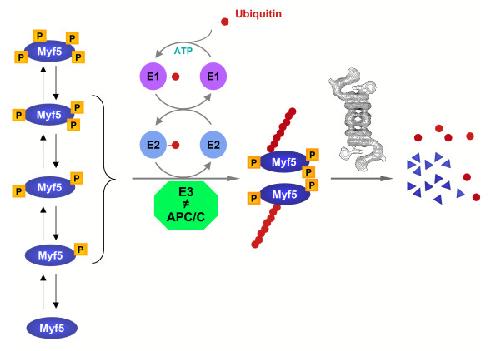 Figure 8. A model for Myf5 mitotic degradation pathway. Myf5 is subjected to multiple phosphorylations in Xenopus mitotic egg extracts, that tightly control its stability: phosphorylation of the protein leads to its ubiquitylation by an E3 distinct from APC/C, and its subsequent degradation by the proteasome. However, a hyperphosphorylated form of Myf5 remains stable (see text for details).