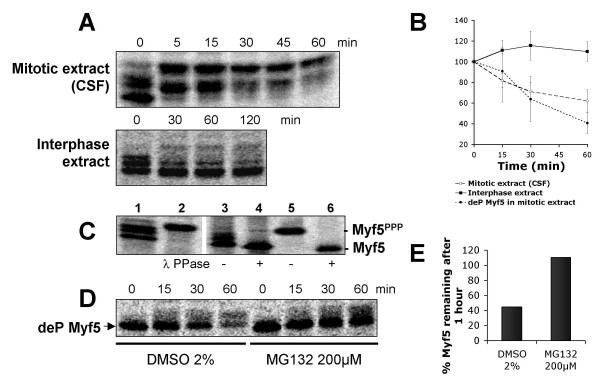 Figure 2. Myf5 is degraded in a cell-cycle dependent manner in Xenopus egg extracts, and its degradation is correlated with changes in its phosphorylation status. (A) Myf5 is phosphorylated and degraded in mitotic (CSF) extracts, but dephosphorylated and stable in interphase extracts. Degradation assays were performed as described in Methods; 2 μl samples were taken at the indicated times and resolved by 10% SDS-PAGE. (B) Degradation of Myf5 was quantified and normalized (start = 100%) : black squares represent the average degradation of Myf5 in interphase extracts (5 independent experiments), open circles the average degradation of Myf5 in CSF extracts (7 independent experiments), and black circles the average degradation of dephosphorylated (deP) Myf5 (see Methods section) in CSF extracts (4 independent experiments). Bars represent standard deviation. For each lane, a region corresponding to all non-phosphorylated and phosphorylated forms of Myf5 was quantified using the ImageQuant software (Molecular Dynamics). The apparent increase of Myf5 level in interphase extracts is probably due to the accumulation of all the initially phosphorylated forms of Myf5 (some of them being close to background) into the fastest migrating form of Myf5. (C) All the slower migrating forms of Myf5 are phosphorylated: lane 1: in vitro translated Myf5; lane 2: in vitro translated Myf5 after 1 h incubation with CSF extract in the presence of 1 μM microcystin LR (this treatment leads to hyperphosphorylation of Myf5 (Myf5PPP), see text and figure 3 for details); lanes 3–6: in vitro translated Myf5 (lanes 3 and 4), or Myf5PPP (lanes 5 and 6) were immunoprecipitated with anti-Myf5 antibodies and incubated in the absence or presence of Lambda phosphatase (λ PPase), as indicated. Samples were resolved by 10% SDS-PAGE and analyzed using a PhosphoImager. (D) A mitotic extract was first incubated with 200 μM MG132, or the same volume of pure DMSO as a control, for 10 min at 25°C; dephosphorylated (deP) Myf5 (see method) was then added to the treated extract. At each time point, 2 μl samples were resolved by 10% SDS-PAGE. (E) Relative amounts of Myf5 in the gel shown in D were quantified as above and reported on the graph.
