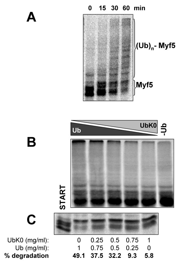 Figure 5. Polyubiquitylation of Myf5 is required for its degradation. (A) Myf5 is polyubiquitylated in mitotic extracts: Myf5 was incubated in a mitotic extract in the presence of ubiquitin (1 mg/ml), MG132 (200 μM) and ubiquitin aldehyde (5 μM). At the times indicated, 2 μl samples were analyzed by 10% SDS-PAGE to visualize the formation of high-MW adducts ((Ub)n-Myf5, poly-ubiquitylated Myf5 molecules). (B) Lysine-less (K0) ubiquitin inhibits Myf5 polyubiquitylation: Myf5 ubiquitylation was performed in a mitotic extract in the presence of MG132 (200 μM), ubiquitin aldehyde (1 μM), ubiquitin (Ub) and lysine-less-ubiquitin (UbK0) at the indicated concentrations, for 30 min at 25°C. (C) Lysine-less ubiquitin stabilizes Myf5: Degradation assays were performed in 20 μl reaction mixtures containing 16 μl of mitotic extract, 2 μl of radiolabeled in vitro translated Myf5 and a mixture of wild type and K0 ubiquitin as indicated. The reaction was performed at 25°C for 40 min, 2 μl samples were resolved by 10% SDS-PAGE. START corresponds to a 2 μl sample taken at time 0 from the reaction containing 1 mg/ml Ub. Radioactivity was quantified as previously described (see legend of figure 2) and percentages of degradation were calculated for each Ub/UbK0 ratio from the difference between the times 0 (not shown) and 40 minutes.