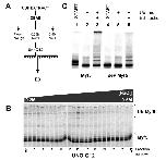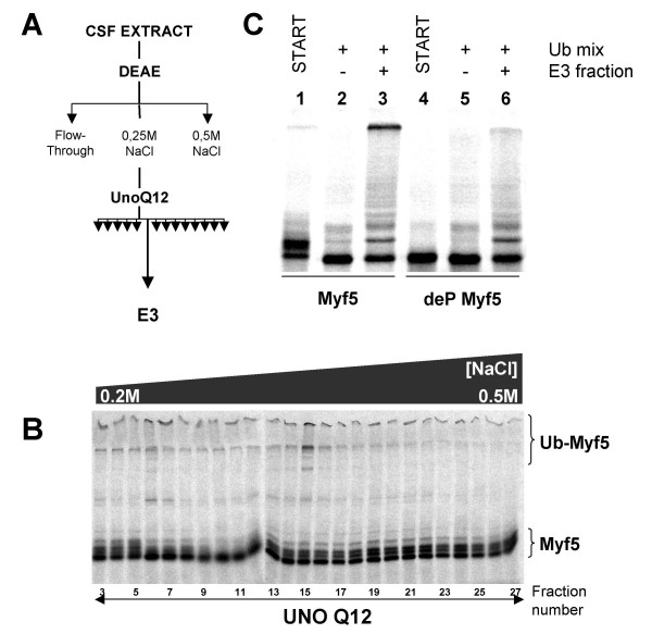 Figure 7. Myf5 ubiquitylation is controlled by phosphorylation. (A) Scheme of Myf5 E3 purification : for details see Methods section. (B) 2 ml of mitotic extract were fractionated as described in A; the fractions obtained from the UnoQ column were screened for their ability to ubiquitylate radiolabeled Myf5 in the presence of a ubiquitylation mix containing GST-Ub (see Methods). The reactions were resolved by 10% SDS-PAGE. (Ub)n-Myf5 indicates poly-ubiquitylated forms of Myf5. (C) The fraction containing the E3 was concentrated about 10-fold using a Centricon 10 K (Millipore). Untreated Myf5 (lanes 1 to 3) or dephosphorylated (deP) Myf5 (lanes 4 to 6) was incubated with the ubiquitylation mix alone (lanes 2, 5) or together with 6 μl of concentrated fraction containing the E3 (lanes 3, 6) for 30 minutes at 25°C. Non incubated Myf5 was loaded in lanes 1 and 4 (START) as control. Similar amounts of radioactive Myf5 and dephosphorylated Myf5 were used.