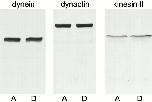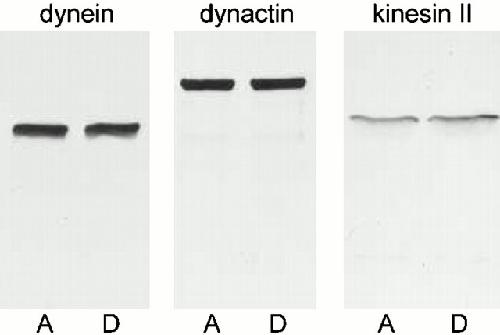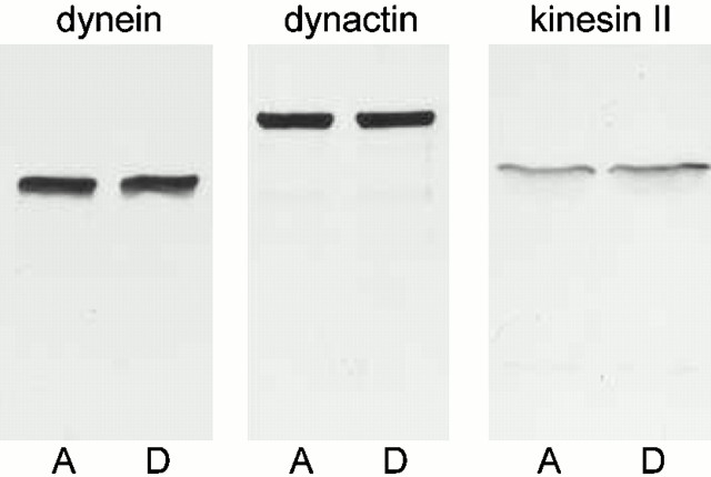Figure 1. Dynein, dynactin, and kinesin II remain on pigment granules during bidirectional transport. Immunoblot analysis of purified pigment granules isolated from equal numbers of aggregated (A) or dispersed (D) melanophores and probed with antibodies to dynein (74.1 antibody against dynein intermediate chain), dynactin (p150 antibody against the p150glued subunit), and kinesin II (K2.4 antibody against the 85-kD subunit).