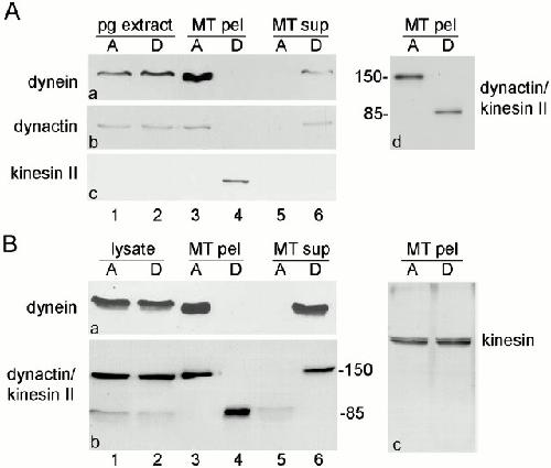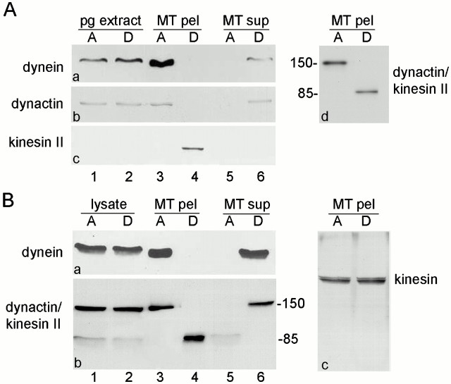 Figure 2. Dynein, dynactin and kinesin II display differential microtubule cosedimentation behavior that varies with the direction of pigment transport. (A) Pigment granule–associated motors/dynactin differentially bind microtubules. Triton X-100 extracts of pigment granules (pg extract, lanes 1 and 2) isolated from aggregated (A) and dispersed (D) melanophores, and the microtubule pellets (MT pel, lanes 3 and 4) and supernatants (MT sup, lanes 5 and 6) obtained after cosedimentation of microtubules with the extracts were immunoblotted for (a) dynein, (b) dynactin, and (c) kinesin II. Microtubule pellets were simultaneously blotted for dynactin and kinesin II (d). (B) The soluble pool of dynein, dynactin, and kinesin II differentially binds microtubules. Clarified lysates (lanes 1 and 2) from aggregated and dispersed melanophores, and the microtubule pellets (MT pel, lanes 3 and 4) and supernatants (MT sup, lanes 5 and 6) obtained after cosedimentation of microtubules with the lysates were probed for dynein (a) or simultaneously for dynactin and kinesin II (b). Microtubule pellets were also probed for conventional kinesin (c). 150, p150glued subunit of dynactin; 85, 85-kD subunit of kinesin II. Dynein, dynactin, and kinesin II exhibit differential microtubule binding as a function of the direction of pigment granule transport whereas conventional kinesin does not.