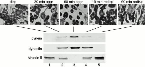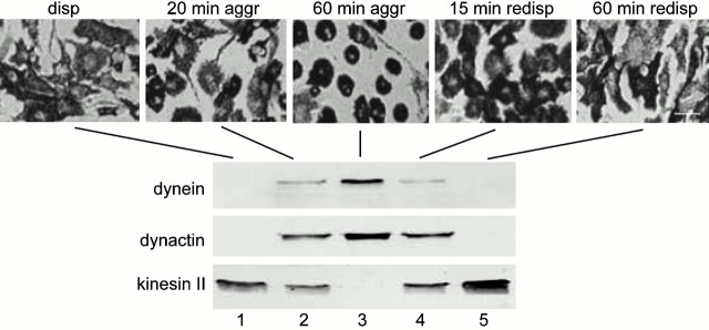 Figure 3. Dynein, dynactin, and kinesin II's microtubule binding activity rises and falls during aggregation and dispersion. Light micrographs of dispersed (disp) melanophores undergoing aggregation (aggr) and then redispersion (redisp) of pigment for the times indicated. The corresponding immunoblots, resulting from cosedimentation of microtubules with soluble motors/dynactin isolated from melanophores at the time points indicated, have been probed for dynein, dynactin, and kinesin II.The pool of active dynein and dynactin increases during aggregation and decreases during dispersion, whereas kinesin II displays the opposite behavior. Bar, 50 μm.