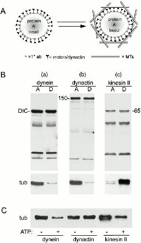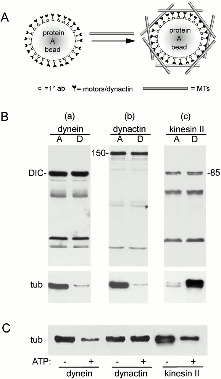 Figure 4. Microtubule capture by immobilized dynein, dynactin, and kinesin II varies as a function of the direction of pigment transport. (A) Model for microtubule capture assay. Protein A beads with bound antibodies (primary antibodies [1° ab] 74.1, p150, or K2.4) are incubated with aggregated or dispersed Xenopus melanophore lysates to immunoprecipitate the appropriate motor/dynactin. Motor/dynactin antibody–bead complexes (left) are then challenged to bind microtubules (MTs). Microtubules are captured by active dynein, dynactin, or kinesin II immobilized on the beads (right). (B) Dynein (a), dynactin (b), and kinesin II (c) from aggregated (A) and dispersed (D) melanophore lysates were immunoprecipitated, incubated with taxol-stabilized microtubules, and probed either for motors/dynactin (top) or for tubulin (bottom). Heavy and light chains of the immunoprecipitating antibodies are also detected in the top panels. DIC, intermediate chain of cytoplasmic dynein; 150, p150glued subunit of dynactin; 85, 85-kD motor subunit of kinesin II; tub, tubulin. Dynein and dynactin from aggregated cells and kinesin II from dispersed cells capture microtubules. (C) Microtubule capture by motors is ATP sensitive. Dynein and dynactin immunoprecipitated from aggregated melanophore extracts and kinesin II immunoprecipitated from dispersed extracts were incubated with taxol-stabilized microtubules, washed, and incubated in the presence (+) or absence (−) of 1 mM ATP. Immunoblotting for tubulin reveals that microtubules dissociate from dynein and kinesin II, but not from dynactin, in the presence of ATP.