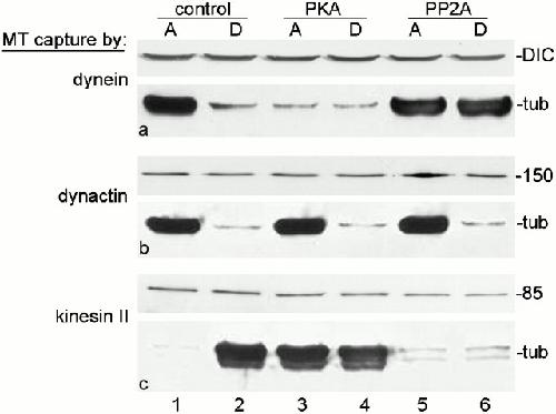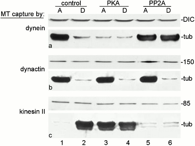Figure 5. Microtubule capture behavior by dynein and kinesin II is reversed by PKA and PP2A. Dynein (a), dynactin (b), and kinesin II (c) were immunoprecipitated from aggregated (A) and dispersed (D) melanophore lysates and then incubated with either ATP alone (control, lanes 1 and 2), with ATP and the catalytic subunit of PKA (lanes 3 and 4), or with PP2A (lanes 5 and 6). Immunoprecipitants were subsequently washed free of ATP and kinase or phosphatase, incubated with taxol-stabilized microtubules, and then assessed for the presence of bound microtubules by immunoblotting for tubulin. The preparations were also blotted for dynein, dynactin, or kinesin II. DIC, dynein intermediate chain; 150, p150glued subunit of dynactin; 85, 85-kD subunit of kinesin II; tub, tubulin. PKA inhibits microtubule (MT) capture by dynein and enhances microtubule capture by kinesin II from aggregated cells, whereas PP2A enhances microtubule capture by dynein and inhibits microtubule capture by kinesin II from dispersed cells. The ability of dynactin to capture microtubules is unaffected by PKA or PP2A treatment. Note that tubulin captured by kinesin II appears as a doublet (c; and see also in Fig. 4 and Fig. 6), suggesting that tubulin may be modified by the kinesin II immunoprecipitate.