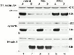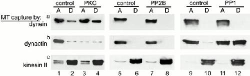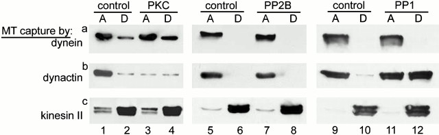 Figure 6. Microtubule capture by dynactin is inhibited by PKC and enhanced by PP1. Dynein (a), dynactin (b), and kinesin II (c) were immunoprecipitated from aggregated (A) and dispersed (D) melanophore lysates and then incubated with either ATP alone (control, lanes 1 and 2) or with ATP and the catalytic subunit of PKC (lanes 3 and 4). Other immunoprecipitants were either incubated in Ca2+/calmodulin (control, lanes 5 and 6) or incubated with Ca2+/calmodulin and PP2B (PP2B, lanes 7 and 8) or were untreated (control, lanes 9 and 10) or incubated with the catalytic subunit of PP1 (lanes 11 and 12). Immunoprecipitants were subsequently washed, incubated with taxol-stabilized microtubules, and assessed for the presence of bound microtubules by immunoblotting and probing for tubulin. PKC inhibits microtubule (MT) capture by dynactin immunoprecipitated from melanophores with aggregated pigment, but has marginal effect on the ability of dynein or kinesin II to capture microtubules. The ability of dynein, dynactin, and kinesin II to capture microtubules is unaffected by PP2B treatment. PP1 treatment enhances microtubule capture by dynactin immunoprecipitated from dispersed melanophore lysates, whereas dynein and kinesin II are unaffected.