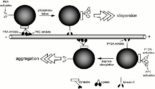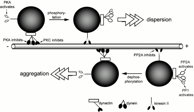 Figure 7. Model for the bidirectional transport of pigment granules along microtubules. Protein phosphorylation and dephosphorylation control the direction of transport in melanophores. A pigment granule at the minus end of a microtubule (left) is bound to the microtubule by active dynein and dynactin (filled heads), whereas inactive kinesin II (clear heads) is unable to bind to the microtubule. PKA and PKC, activated upon stimulation of melanophores with MSH, convert dynein and dynactin to their inactive forms (clear heads), whereas PKA converts kinesin II to its active form (filled heads), allowing it to bind to microtubules. Active kinesin II transports the pigment granule towards the plus end of the microtubule, the direction of pigment granule transport corresponding to dispersion in vivo. Active kinesin II (filled heads) on a pigment granule at the plus end of the microtubule (right) is converted to its inactive form (clear heads) by PP2A when PKA activity is depressed upon stimulation of melanophores with melatonin. Simultaneous modification by PP2A of dynein activates it (filled heads) to its microtubule binding form. Active dynein transports the pigment granule towards the minus end of the microtubule. Activation of dynactin to its microtubule binding form (filled heads) by PP1 may enhance dynein-mediated transport or may anchor pigment granules at the minus ends of microtubules after their transport.