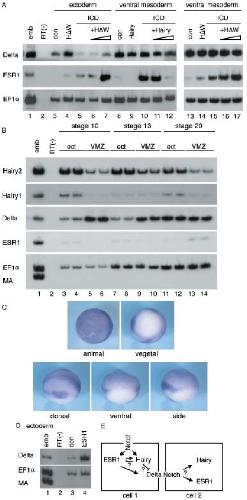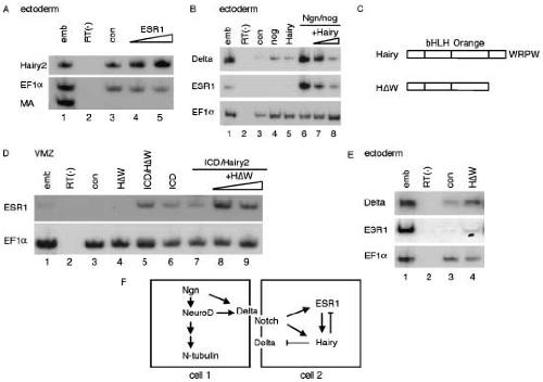 2 (C), rescued the repressed expression of ESR 1 by Hairy 2 in VMZ (D) and de-repressed expression of Delta and ESR 1 in normal