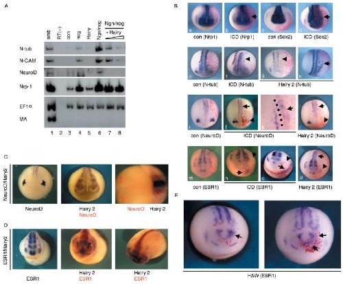 and ESR 1/Hairy 2 (D). In the right panel of (C), the embryo was cut into two parts, which were probed for NeuroD (Red) and Hairy