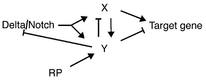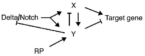 and regulated by Notch and other repressive pathway(s) (RP),