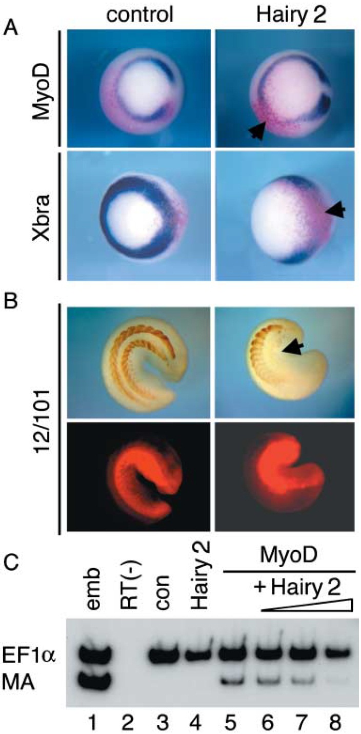 shows Hairy inhibits MA expression induced by MyoD. Amounts