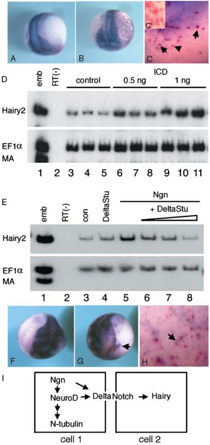(E). (F–H), Induction of Hairy 2 by Neurogenin. Note the ectopic
