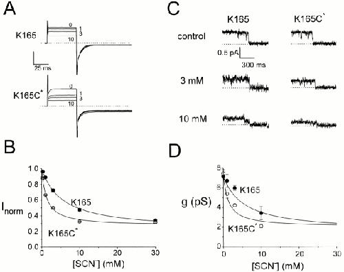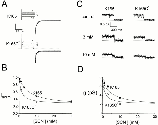 Figure 3. Comparison of the SCN− block between K165 and K165C* channels. (A) SCN− block of the whole oocyte current. Pulsing protocol 2. Numbers indicate the SCN− concentrations (millimolar) in the bath solution. Dotted lines are zero-current level. Vertical scale bar represents 12 and 2 μA for K165 and K165C*, respectively. (B) The K165C* channel was more sensitive to the SCN− block. Data points derived from experiments like those in A. Solid curves were drawn according to: Inorm = I∞ + (1 − I∞)/(1 + [SCN−]/K1/2), with values of K1/2 and I∞: (K165) 5.5 mM and 0.21; (K165C*) 1.3 mM and 0.27 (n = 4). (C) Single-channel recording of the SCN−-blocked K165 and K165C* channels at +40 mV. Symmetrical solutions on both sides of the membrane except that the indicated concentrations of NaSCN were added in the pipette solution. Dotted lines are zero-current level. (D) Averaged single-pore conductance at +40 mV (n = 3–8). The two current levels in traces like those shown in C were determined from all-points amplitude histograms and the difference in current was divided by two to calculate the conductance of one pore. Solid curves are the same curves from B after multiplying the respective channel conductance in the absence of SCN−.