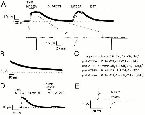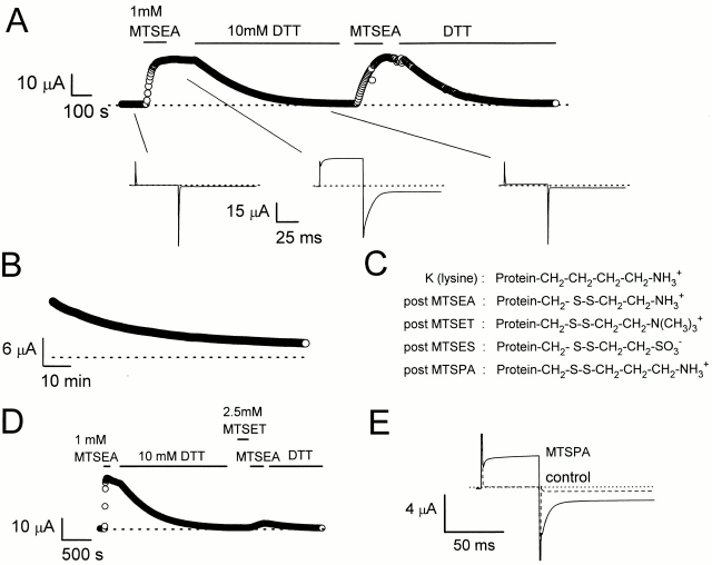 Figure 1. Modification by MTS reagents of K165C/C212S channels expressed in Xenopus oocytes. (A) Functional current induced by MTSEA. Repeated pulsing protocol 2, given one pulse every 2 s. Reagents applied as indicated by horizontal lines. (○) Current amplitudes measured at +40 mV. Examples of the current traces before and after MTSEA, and finally after dithiothreitol treatment are shown. Dotted lines are zero-current level. (B) Reduction of MTSEA-induced current after washout of the modifying reagent. Repeated pulsing protocol 1. Temperature, 20°C. (C) Side-chain structure of lysine and those of cysteine modified with various MTS reagents. (D) Modification of K165C by MTSET without generating functional channels. Pulsing protocol 1 used in this experiment. MTSES produced similar effects in blocking the current induction by MTSEA (data not shown). (E) Current induction in K165C channel by MTSPA. Dashed and solid curves represent the average of three recording traces before (control) and after the application of 0.2 mM MTSPA. Dotted line is zero-current level.