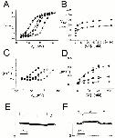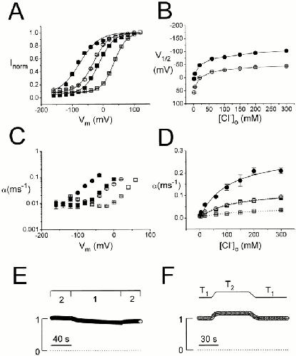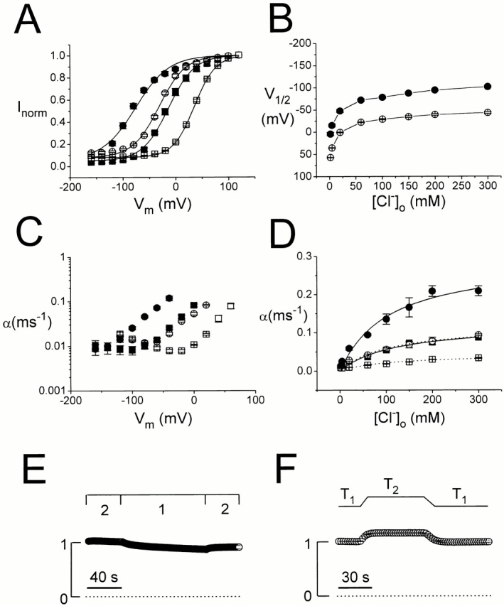 Figure 2. Fast- and slow-gating properties of K165 (filled symbols) and K165C* channels (open symbols) derived from macroscopic current recordings. (A) Comparison of the fast-gate Po-V curves at 100.6 (circles) and 4.6 mM (squares) of [Cl−]o. Solid curves were drawn according to a Boltzmann equation: Po = Pmin + (1 − Pmin)/{1 + exp[−zF(V − V1/2)/RT]}, with z = 0.8–1.2, Pmin = 0.05–0.08. V1/2s in 100.6 and 4.6 mM [Cl−]o were: (K165) −76 and −14 mV; (K165C*) −31 and 35 mV. (B) V1/2s of the fast-gate Po-V curves as a function of [Cl−]o (n = 3–8). (C) Opening rates, α, of the fast gate for K165 and K165C* channels in 100.6 and 4.6 mM [Cl−]o. Symbols are the same as in A (n = 3–8). (D) Opening rates of the channels as a function of [Cl−]o. Data points taken at −40 (•) and −80 mV (▪) for the K165 channel and at 0 (○) and −40 mV (□) for the K165C* channel. Solid and dotted curves were the best fit to the hyperbolic equation, α = αmax[Cl−]o/(K1/2 + [Cl−]o). The fitted αmaxs are (ms−1): K165, 0.29 (−40 mV) and 0.12 (−80 mV); K165C*, 0.12 (0 mV) and 0.04 (−40 mV). The fitted K1/2s are (mM): K165, 107 (−40 mV) and 121 (−80 mV); K165C*, 103 (0 mV) and 108 (−40 mV). (E) Slow-gating transition examined by voltage activation. 30–40 μM MTSEA in the bath solution. Numbers 1 and 2 are the pulsing protocols (see materials and methods) used in the indicated periods (n = 3). Current amplitudes normalized to that of the point right before pulsing protocol 1. Dotted line represents zero-current level. (F) Temperature jump experiment revealed that the probability of closing the slow gate was only minimal upon raising the bath temperature. Pulsing protocol 1. 30–40 μM MTSEA was present. Current amplitudes normalized to that of the first point. T1 = 21.4°C, T2 = 27.5°C (n = 3).