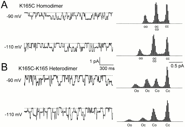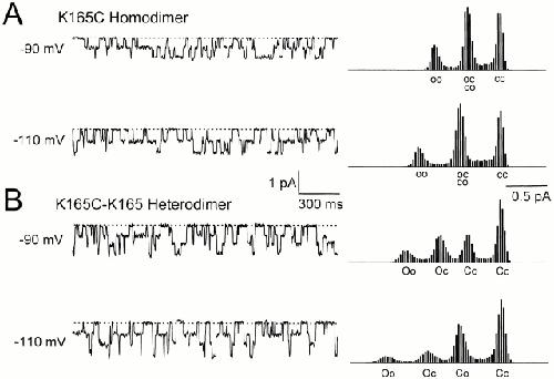 Figure 4. (A) Single-channel recordings of the MTSPA-modified K165C homodimer at −90 and −110 mV. Dotted lines represent zero-current level. Next to each trace are current amplitude histograms compiled from 30 s (top and bottom) of recording traces containing the 2-s examples on the left. (B) Single-channel recordings of the MTSPA-modified K165C-K165 heterodimer. Amplitude histograms were from 23 s (top) and 30 s (bottom) of recording traces. Capital and small letters represent the pores with big and small conductances, respectively. C, close; O, open. The smaller conductance level in the heterodimer corresponds to the MTSPA-modified pore and is equal to the conductance levels in the homodimer shown in A.