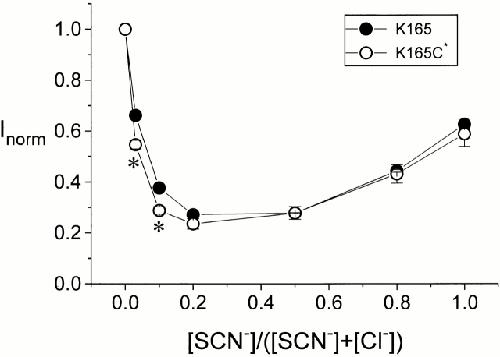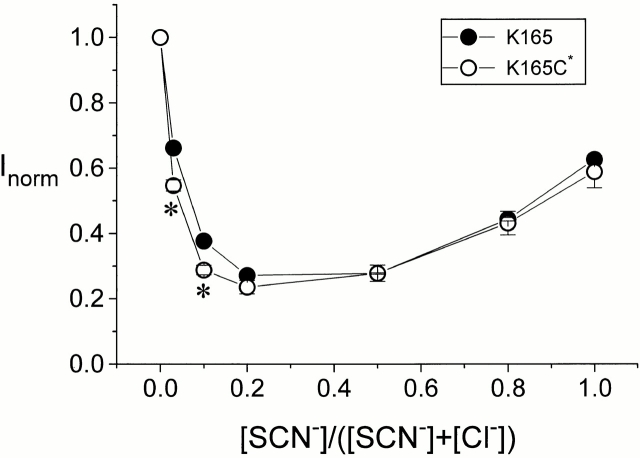 Figure 5. Comparison of the anomalous mole fraction effect for mixtures of Cl− and SCN−. All measured currents were normalized to the current obtained in the absence of NaSCN. Each point represents the average of four measurements. *Significantly different (P < 0.05, Student's t test) from the K165 channel.