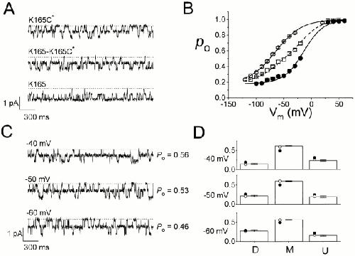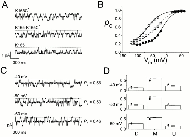 Figure 6. Fast-gating properties of heterodimers after MTSEA modification. (A) Single-channel recording traces of K165C*, K165-K165C*, and K165 channels. Membrane potential, −40 mV. Dotted lines are zero-current level. (B) Po-V curves derived from single-channel recordings (n = 3–7). Solid curves are Boltzmann curves for K165 (○) and K165C* (•) channels, while the dashed curve is simply the average of the two solid curves. (□) The measured Po of the heterodimers (average of K165-K165C* and K165C*-K165). (C) Single-channel recordings of the heterodimer K165C*-K165 at three different voltages. Open probabilities shown on the right were calculated from >40-s continuous recordings, including the three traces shown at left. (D) Comparison of the measured state probabilities (bars) with the expected state probabilities (circles). (•) Calculated from the averaged Po of the heterodimer according to (binomial distribution). (○) Calculated according to , assuming distinct Po's for two pores (multinomial distribution). The open probabilities were taken from the Po's of the homodimers at the corresponding voltages shown in B. Statistical analysis showed significant difference (P < 0.01, one sample t test, SPSS 8.0; SPSS, Inc.) between the measured probabilities of the M level and the expected values derived from the binomial model in all three voltages. The comparisons of the measured probabilities with the expected values from the multinomial model, however, showed no difference (P > 0.01).