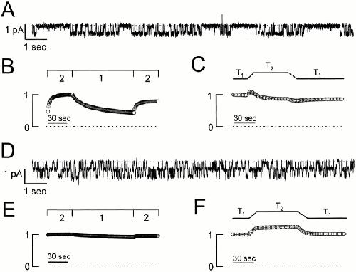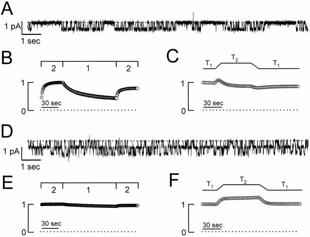 Figure 8. Slow-gating behaviors of the heterodimer. (A–C) Slow gating of the heterodimer without MTSEA modification. (A) Single-channel trace at −60 mV revealed two current levels and several short inactivation events. (B) Voltage activation experiment to examine slow-gating transitions at the macroscopic current level (n = 3). (C) Temperature-jump experiment revealed prominent inactivation relaxation (n = 3). T1 = 22.5°C, T2 = 28.2°C. Symbols and experimental procedures for B and C were as in Fig. 2E and Fig. F. (D–F) Slow-gating behaviors of the MTSEA-modified heterodimers. (D) Single-channel recording of a MTSEA-modified heterodimer. Membrane potential, −60 mV. (E and F) Voltage and temperature jump experiments (n = 3). Procedures were as in B and C with 30–40 μM MTSEA in the bath. T1 = 21.9°C, T2 = 28.1°C.