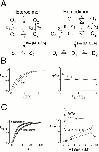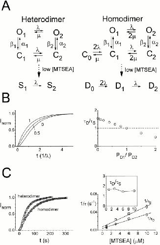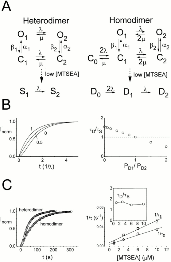 Figure 9. Independence of MTSEA modification on the introduced cysteines. (A) Reaction schemes for MTSEA modification. When the modification rates are smaller than the slow-gating transition rates, the schemes can be reduced to linear models. (B) Slow-gate open probability contributes to the apparent MTSEA-modification rate. (Left) Calculated current-induction curves of the homodimer () when PD1/PD2 are 0, 0.5, and 1, respectively. The normalized curve of the heterodimer () is the same as that of the homodimer when PD1/PD2 = 1. (Right) Ratios of the time constants derived from single-exponential curve fittings plotted against PD1/PD2. (C) Experimental comparison of the apparent modification rates between hetero- and homodimeric channels. (Left) Current induction in the heterodimer (□, n = 6) and homodimer (○, n = 3) by 3 μM MTSEA. All current amplitudes, after subtraction by the current before applying MTSEA, were normalized to the maximal current induced by MTSEA. One error bar plotted in every 10 points. Time constants were 49.3 and 80.7 s for the hetero- and homodimer, respectively. (Right) Current-induction rates in the homodimeric (○) and heterodimeric channels (□) at various concentrations of MTSEA. The slopes and y intercepts of the solid lines were: (heterodimer) 7.2 × 103 M−1s−1 and 0.0037 s−1; (homodimer) 4.6 × 103 M−1s−1 and 0.0032 s−1. (Inset) Ratios of the induction time constants of the homodimer to those of the heterodimer.