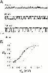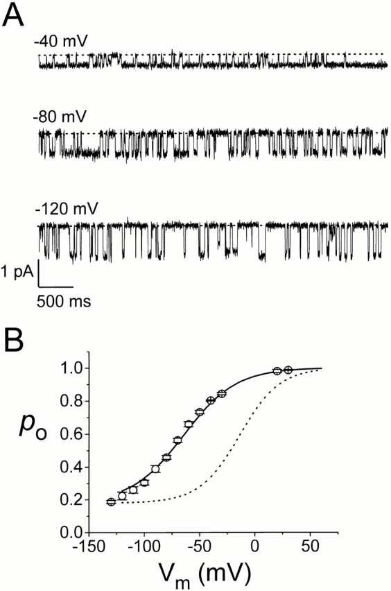 Figure 7. Fast gating of the heterodimer without MTSEA modification. (A) Single-channel recording traces of the heterodimer K165C-K165 at different voltages. Dotted lines represent zero-current level. (B) Steady state Po-V curve of the single-pore heterodimer. (○) The average of three to eight measurements from traces like those shown in A. Solid and dotted curves are the same Boltzmann curves for the K165 and K165C* homodimers, respectively, as those shown in Fig. 6 B.