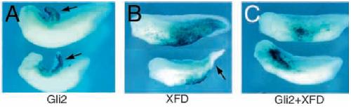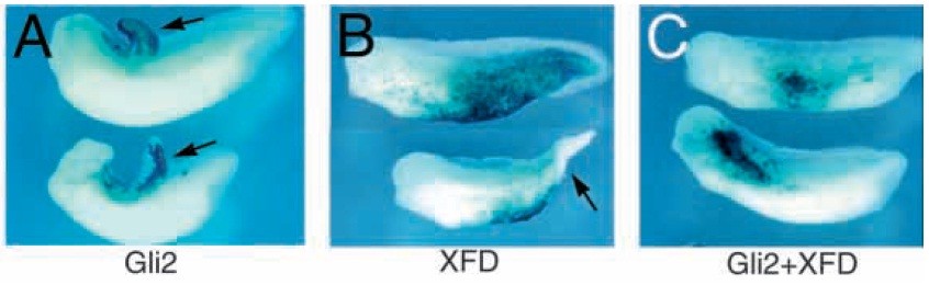 co-injection of lacZ (as a lineage marker) and Gli2 RNAs result in