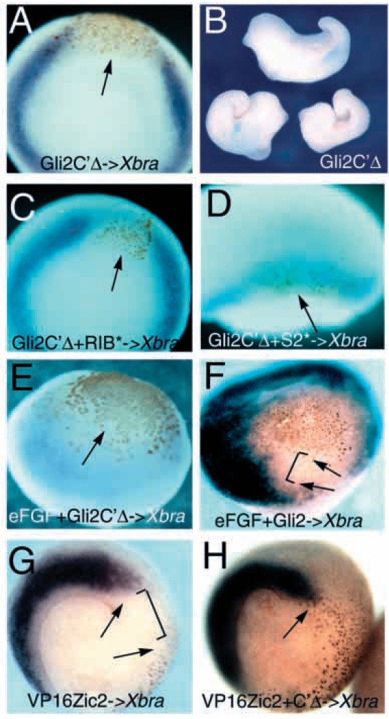 Gli2 inhibits Xbra (arrows and bracket) by co-expressed eFGF in a