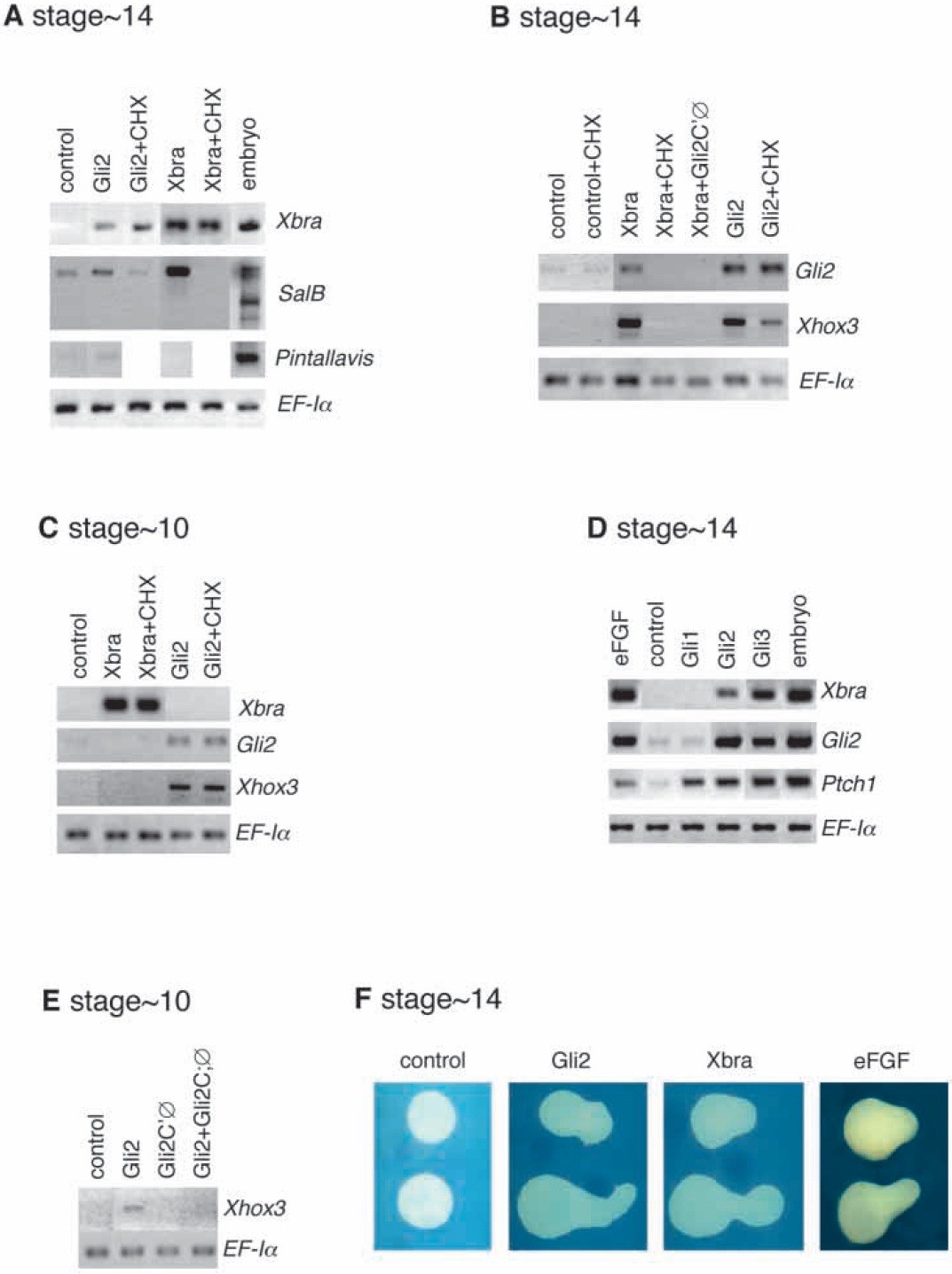 (Gsc). Expression of the housekeeping gene EF1a is used as control. (D,E) Endogenous expression (arrows) of Gli2 (D) and Gli3 (E) in the