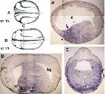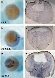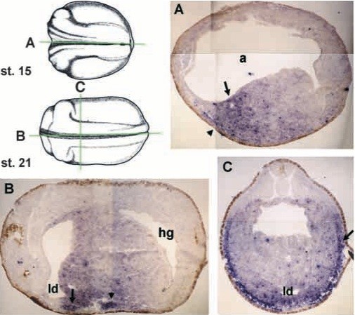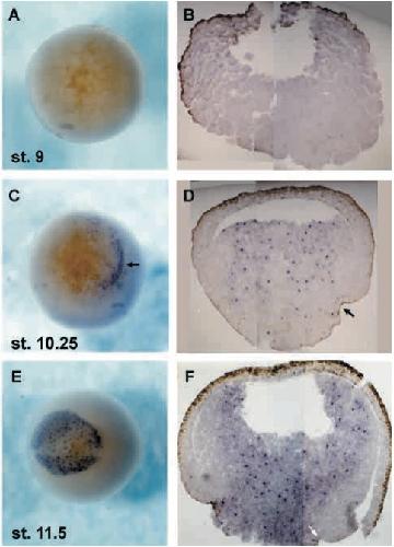 Fig. 1. GATA5 is expressed in prospective endoderm during Xenopus gastrulation. Whole-mount in situ hybridisations of embryos viewed from the vegetal pole (A,C,E) and in situ hybridisations on sections of corresponding stages (B,D,F), using a GATA5-specific probe. No GATA5-specific staining is obvious in blastula stage (st. 9) embryos (A,B). At the early gastrula stage (st. 10.25), staining is seen in bottle cells and in the sub-blastoporal endoderm (C,D). In the advanced gastrula (st. 11.5), GATA5 accumulates in the sub-blastoporal endoderm and appears to be excluded from the involuting mesendoderm at the dorsal and ventral side of the embryo (E,F). Arrows in C,D,F mark the dorsal blastoporal lip.