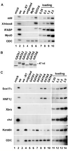 Fig. 5. GATA4 and GATA5 induce endodermal marker genes in animal cap explants. (A) RT-PCR of whole embryos (we), uninjected or with 50 pg Myf5 or GATA5 injected animal caps at stage 33/34, using primers for the indicated genes. GATA5 induces Xlhbox8 and IFABP. To assess for genomic contamination an RT reaction without reverse transcriptase was performed on whole embryo RNA (we-RT) and general contamination was assessed by taking a mock tube through RNA preparation, RT-reaction and PCR. ODC served as a loading control and sample titrations were performed to ensure that signals were in the linear range (oading. (B) In vitro translation of GATA1 6 mRNAs in reticulolysate lysate, demonstrating that all GATA RNAs translate with similar efficiencies. (C) RT-PCR of whole embryos (we), uninjected (lane 4) or with 50 pg of GATA1, 2a, 3, 4, 5 or 6 RNAs injected (lane 5-10) animal caps at stage 11 using primers for the indicated genes. GATA4 and 5 clearly induce Sox17α and HNF1β and downregulate cytokeratin. Controls were as for part A.