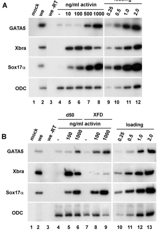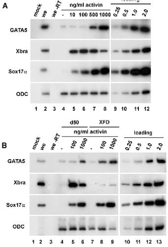 Fig. 8. High concentrations of activin induce GATA5 in an FGF independent manner. (A) RT-PCR of animal caps at stage 11.5 equivalent incubated with the indicated concentrations of activin. (B) Stage 11.5 animal caps injected with RNAs for a control receptor (d50) or a dominant negative FGF-receptor (XFD) before treatment with the indicated concentrations of activin. 500 pg d50 or XFD RNAs were injected into the animal pole of each blastomere of two- cell embryos. Controls were as described in the legend to Fig.5A.