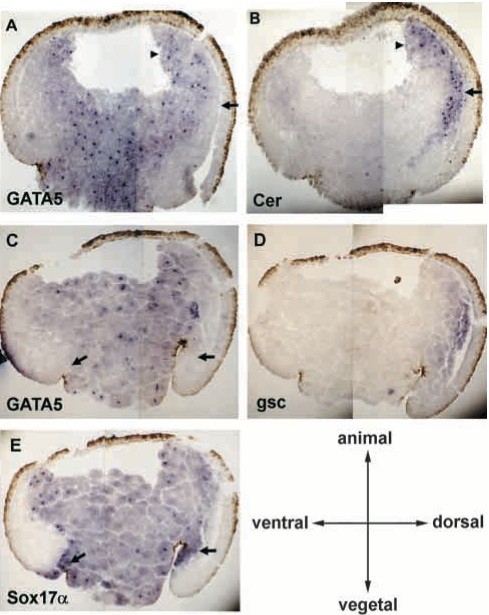 Fig. 2. GATA5 is restricted to the sub-blastoporal endoderm at mid- gastrula stages. In situ hybridisation of serial sections of stage 11.5 embryos using GATA5 (A) and cerberus (B) or stage 11 embryos using GATA5- (C), goosecoid- (D) and Sox17a- (E) specific probes. GATA5 overlaps with cerberus in the dorsoanterior yolk-rich cells (arrowheads), but not in more posterior located smaller cells, which appear to represent the leading edge of the involuting mesendoderm (arrows in A,B). GATA5 is excluded from prechordal plate mesendoderm stained by goosecoid and the supra-blastoporal endoderm, which is strongly stained by Sox17a (arrows in C,E).