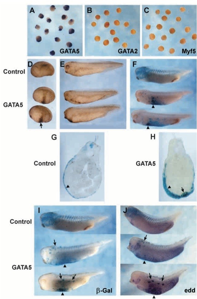 Fig. 4. GATA5 respecifies prospective ectoderm towards endoderm. Whole-mount in situ hybridisation to endodermin of GATA5- (A), GATA2a- (B) or Myf5- (C) injected animal caps at stage 31 equivalent. Injection of GATA5 mRNA induces patches of ectopic endodermin. (D,E) GATA2a (top row) or GATA5 (bottom rows) injected embryos at stage 22, showing GATA5 induced ectopic pigment (D, arrow) or stage 36 embryos showing GATA5 induced loss of eyes (E). Fertilised eggs were injected in the animal pole with 100 pg Myf5 or GATA2a RNAs or 50 pg GATA5 RNA. beta-Galactosidase-stained larvae at stage 34 (F) injected in the animal pole with RNA coding for nuclear localised β-galactosidase on its own (top row) or coinjected with 50 pg GATA5 RNA (bottom rows). Arrowheads mark the areas with strongest β- galactosidase staining in GATA5-injected embryos. Vibratome cross sections of β-galactosidase-stained control (G) or GATA5-injected embryos (H) through the midgut region (arrowheads in F). β-Galactosidase staining is restricted to the ectoderm in control embryos and covers several cell layers in GATA5- injected embryos (arrowheads in G and H). Ectopic pigment is marked with an arrow in H. (I,J) Control (top row) or GATA5-injected embryos (bottom rows) at stage 34 after β-galactosidase staining (I,J) and in situ hybridisation with an endodermin specific probe (J). In control embryos, lacZ-positive (turquoise) and endodermin-expressing cells (purple) do not overlap. In GATA5-injected embryos, many lacZ-positive cells in the ventral region (arrowheads) and in isolated patches (arrows) express endodermin.