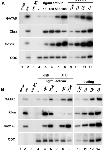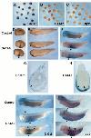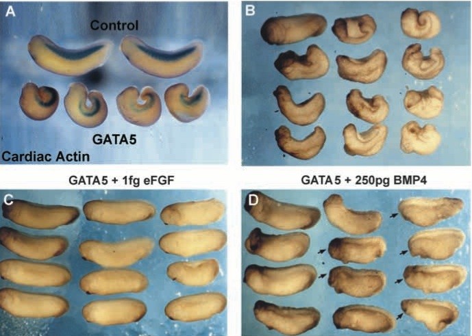 25 pg GATA5 and 1 fg eFGF (C), or 25 pg GATA5 and 250 pg BMP4 (D) and cultured until stage 30. Embryos in the bottom row of A and in B, except for the top leftembryo in B, are characterised by an open blastopore. 1 fg eFGF rescues to the wild type phenoptype (C) and embryos rescued with 250 pg BMP4 are either wild type or ventralised (D), as assessed by the loss of head structures (arrows). ((A) In situ hybridisation with a cardiac actin specific probe at stage 30 demonstrates the reduced somitic tissue in GATA5-injected embryos compared to control embryos).