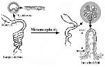 (arrowheads) appear as islets between the larval epithelium (le) and the connective tissue (ct). They are stained deep red with methyl